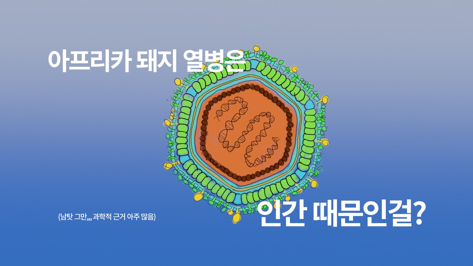 1800년대부터 2015년까지 ASF 바이러스의 유전적 다양성이 꾸준하고 빠르게 증가하고 있다. 이는 영국이 케냐를 식민지화하고 돼지 산업이 커지는 시기와 맞물린다. 즉, 문제의 시작은 바이러스가 아니라 인간이었다. 특정 지역에 살던 돼지를 ‘가축화’시키고 그 돼지를 자신들 마음대로 수입 수출한 데서 문제가 발생했다. 이 바이러스는 가축화된 돼지뿐만 아니라 전 세계의 야생 멧돼지(wild boar)도 죽이고 있다. 가축화된 돼지(domestic pigs)는 야생 멧돼지(wild boar)를 가축화해 만든 종이기 때문이다. 공장식 축산 이전에는 특정 종이 전 세계에 굉장히 많이 존재하는 것은 거의 불가능했다. 하지만 현재에는 가능하며, 이 문제는 바이러스에 굉장히 취약할 수밖에 없는 환경을 조성한다. 2020년 2월 통계에 의하면 한국에만 1128만(11.28million) 마리의 ’가축화된’ 돼지가 있다. 한국 인구의 ⅕ 정도에 달하는 숫자이다.